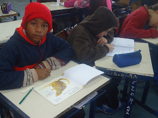Abaixo temos algumas fotos do trabalho de releitura de histórias infantis realizado pela professora Elisete com as turmas dos sextos anos do Ensino Fundamental da escola.
